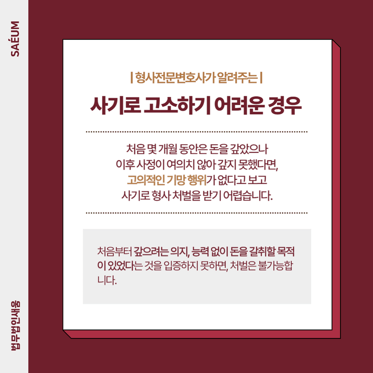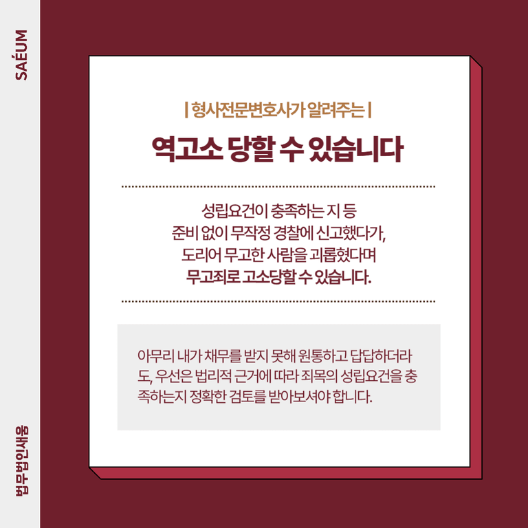 따라서 아무리 내가 채무를 받지 못해 원통하고 답답하더라도, 우선은 법리적 근거에 따라 죄목의 성립요건을 충족하는지 정확한 검토를 받아보셔야 합니다. 아무런 준비 없이 무작정 경찰에 신고했다가, 도리어 무고한 사람을 괴롭혔다며 무고죄로 고소당하는 일이 생기지 않도록, 전문 변호사의 자문을 구한 후 결정하시기 바랍니다.