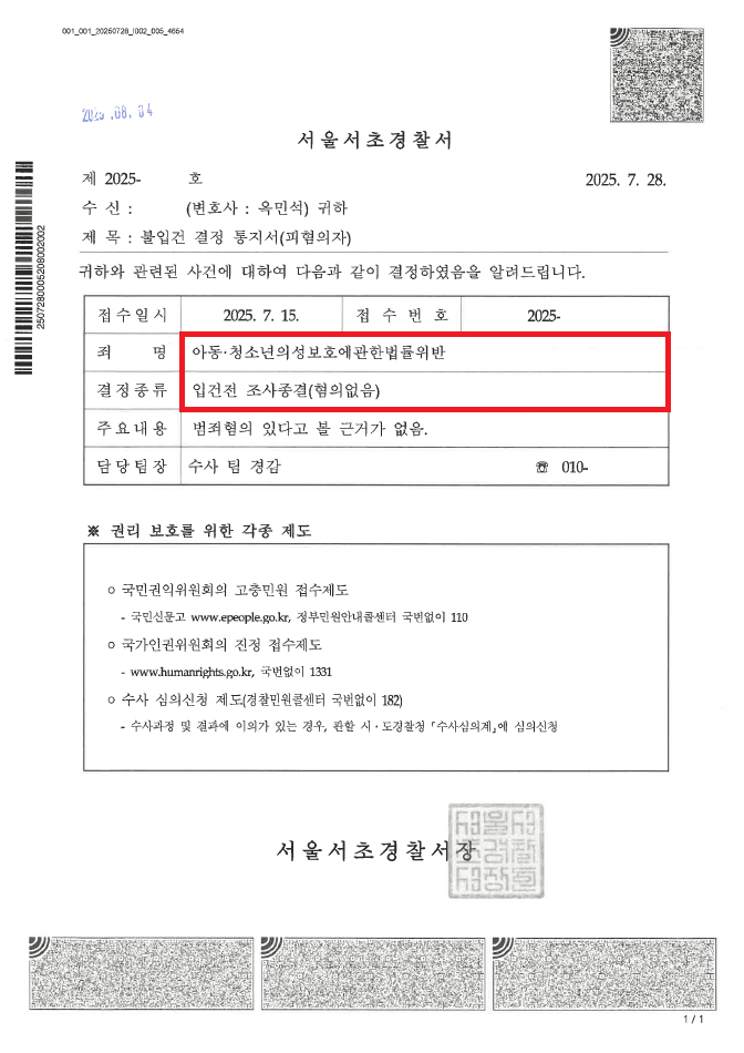 이러한 저의 조력을 바탕으로 A씨는 경찰단계에서 '불입건(혐의없음)' 결정을 받음으로써 압수·수색 영장을 집행당하지 않고 수사개시통보가 되지 않으며 수사기록도 남지 않는 등 어떠한 불이익도 받지 않은 채 일생일대의 위기에서 벗어날 수 있었습니다.