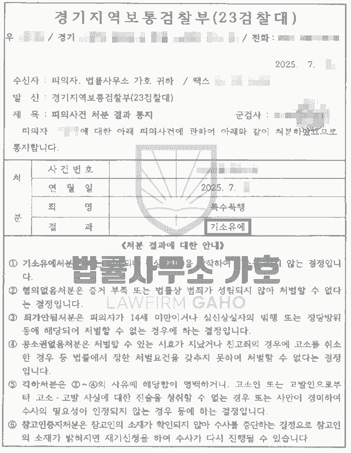 특수폭행은 반의사불벌이 적용되지 않아 합의하더라도 중한 처벌의 가능성이 있었음에도 불구하고, 사건발생 직후부터 바로 군수사기관의 특수성을 제대로 알고 있는 군 전문 변호사와 함께 했기 때문에 치열한 진술조력과 법리검토를 통해 재판까지도 가지 않고 수사단계에서 종결한 성공적인 사건이었습니다.