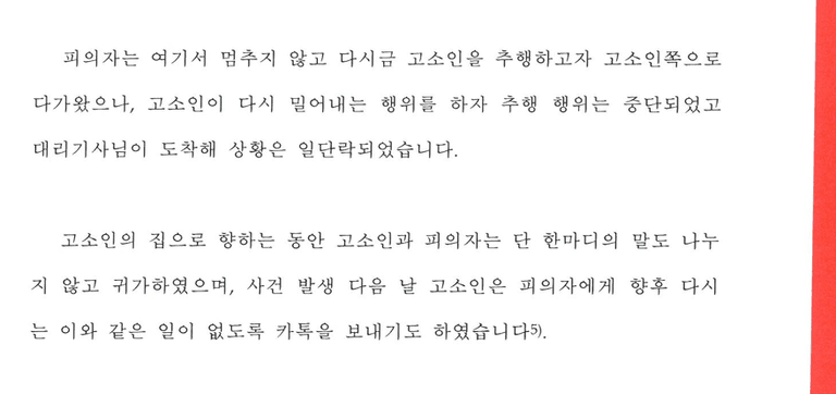 사건 발생일로부터 약 3년의 시간이 지난 후 고소 절차를 진행하게 되었던 탓에 당시 블랙박스 영상 등의 증거자료는 확보할 수는 없었으나 당시 카톡내역 및 의뢰인분의 진술 등을 정리하여 고소절차를 진행하였고, 고소 절차 진행 간 고소가 지연된 사유에 대하여도 어느 정도 소명이 필요한 사건이었습니다.