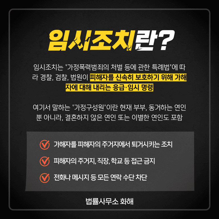 임시조치는 연인 간 폭력 사건에서 피해자가 긴급하게 보호받을 수 있도록 마련된 조치입니다. 이 조치는 ‘가정폭력범죄의 처벌 등에 관한 특례법’(이하 ‘가정폭력처벌법’)에 근거하고 있는데, 여기서 특히 주목할 점은 ‘가정’이라는 단어의 의미입니다. 흔히 ‘가정’이라 하면 가족이나 부부 같은 관계만을 떠올리기 쉽지만, 가정폭력처벌법에서 정의하는 ‘가정구성원’에는 현재 교제하고 있는 연인뿐 아니라 동거 중인 연인, 사실혼 관계, 그리고 과거 연인 관계였던 사람까지도 포함됩니다.