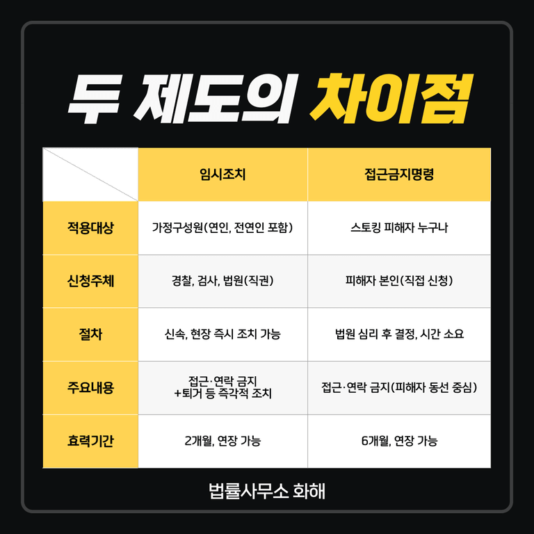 첫째, 적용 대상이 다릅니다. 임시조치는 가정폭력처벌법이 적용되기 때문에 ‘가정구성원’ 간의 폭력에 한합니다. 여기서 가정구성원에는 현재 또는 과거 연인도 모두 포함됩니다. 반면, 접근금지명령은 스토킹 피해자라면 누구나 신청할 수 있어 적용 범위가 더 넓습니다.