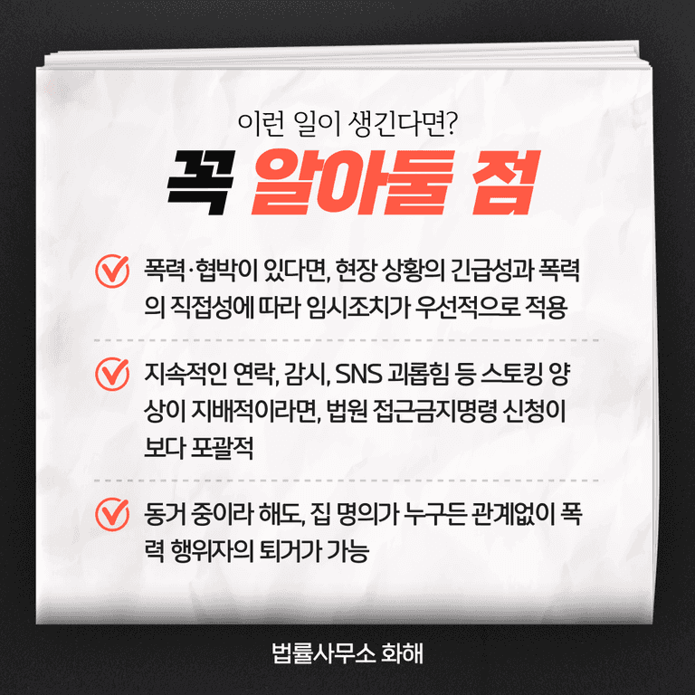 등이 가능합니다. 특히 동거하고 있는 연인 사이에서 폭력이 발생했을 경우, 가해자를 즉시 집에서 내보낼 수 있는 실효성 있는 보호수단이 됩니다.