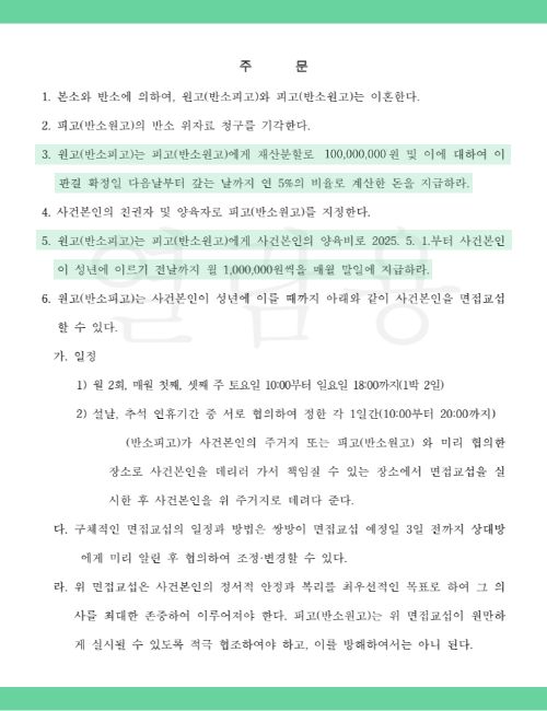 양육비도 B씨가 요구한 월 200만 원에서 절반인 100만 원으로 조정되어, 자녀가 성인이 될 때까지 매월 지급하는 조건으로 마무리되었습니다.