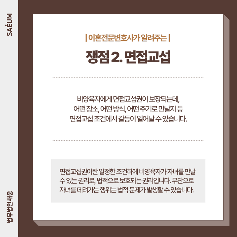 면접교섭권이란 일정한 조건하에 자녀를 만날 수 있는 권리로, 법적으로 보호되는 권리입니다.