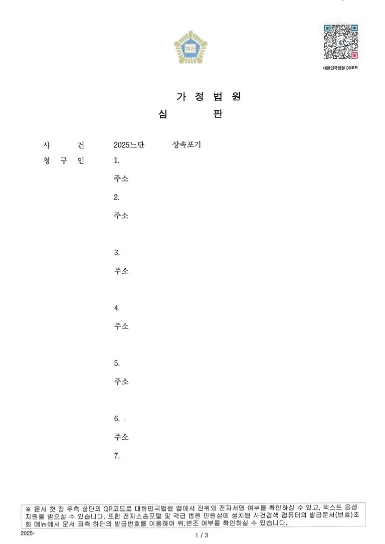 이에 권리 관계를 모두 정리한 후 상속포기를 진행하고, 돌아가신 분의 재산은 한 분이 정리할 수 있도록 조치하여 드렸습니다. 상속인들이 전국 각지에 거주하고 있었지만 신속하게 필요한 서류를 받는 등 준비를 하였습니다.