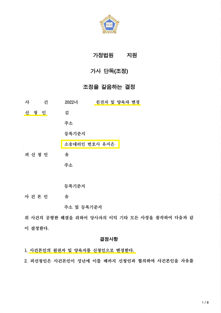 그럼에도 저희는 친권자 및 양육자를 의뢰인으로 변경하는 것이 사건본인의 복리를 위해 필요하고, 아이 또한 친권자 및 양육자로 의뢰인이 지정되기를 원한다는 점을 적극 강조하였습니다.