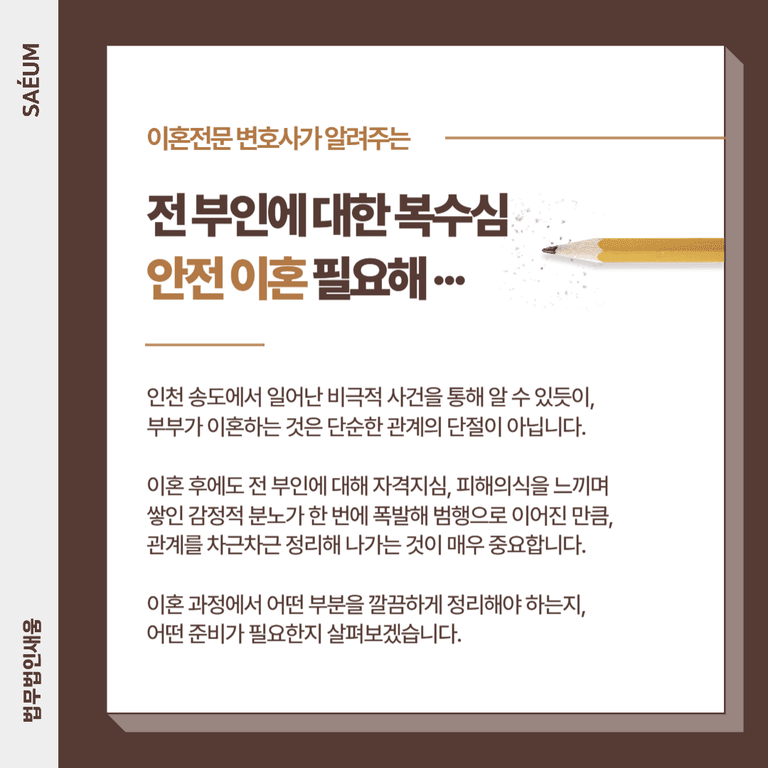 이 사건을 통해 알 수 있듯이, 부부가 이혼을 하는 것은 단순한 관계의 단절이 아닙니다. 이혼 후에도 전 부인에 대해 자격지심, 열등감, 피해의식을 오랜 기간 느끼며 쌓인 감정적 분노가 한 번에 폭발하면서 범행으로 이어진 만큼, 관계를 차근차근 정리해 나가는 것이 매우 중요합니다.