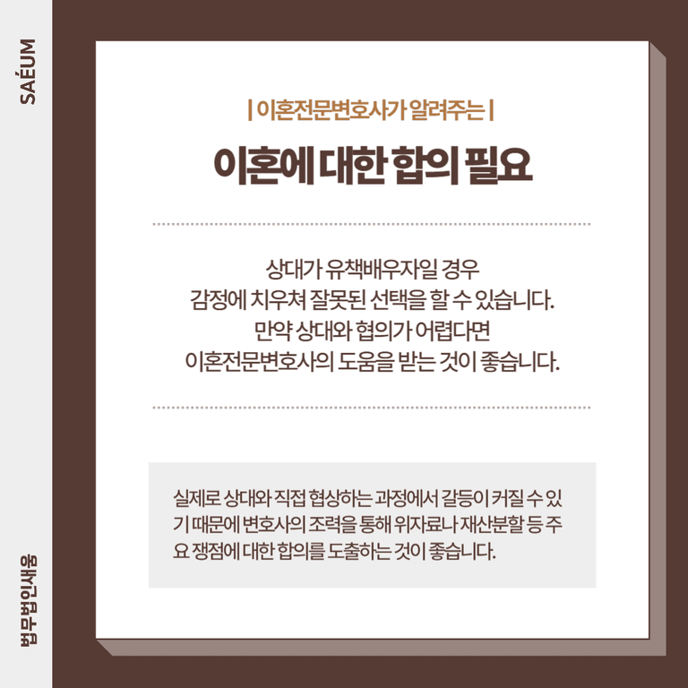 이 경우 감정에 치우쳐 바로 재판을 청구하면, 상대의 반발심을 키워 진흙탕 싸움으로 번질 수 있습니다. 그로 인해 원하는 결과를 얻지 못할 수 있고, 이혼 후에도 상대가 악감정을 품을 가능성이 커집니다.
