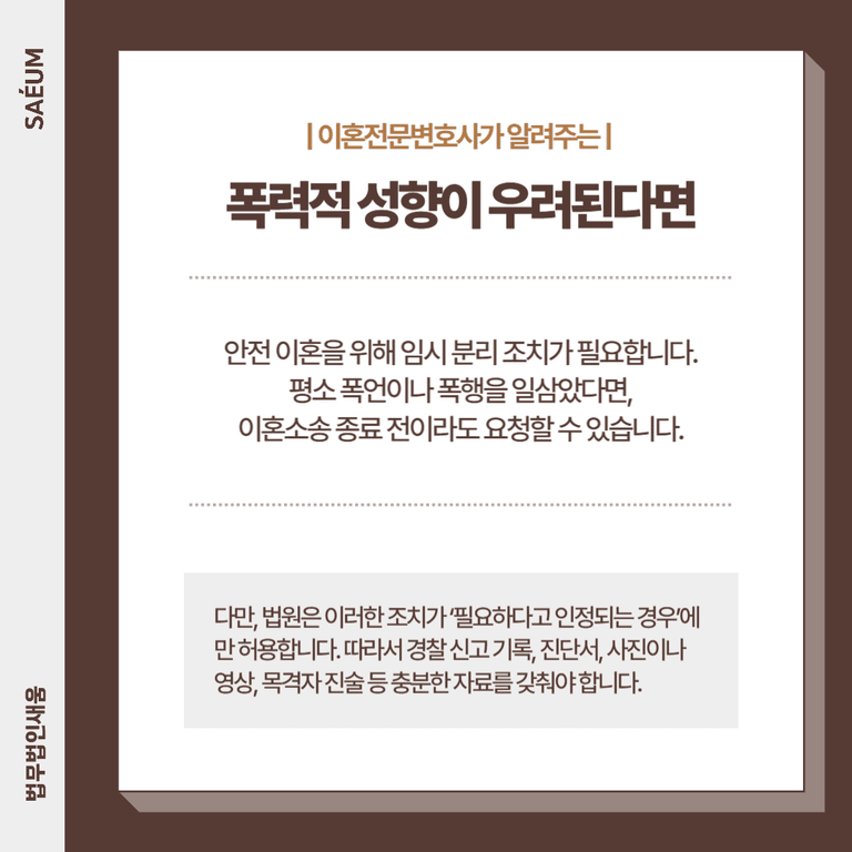 다만, 법원은 이러한 조치가 ‘필요하다고 인정되는 경우’에만 허용합니다. 따라서 경찰 신고 기록, 진단서, 폭력적인 장면이 담긴 사진이나 영상, 목격자 진술 등 충분한 자료를 갖추어야 하며, 이를 위해 변호사와 상담하여 사전 준비를 철저히 해야 합니다.