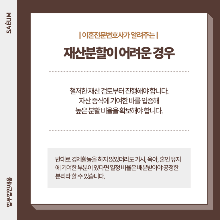 혼인을 정리할 때는 재산분할을 명확하게 하는 것이 장기적으로 양측 모두에게 유리합니다. 만약 본인이 경제활동을 활발히 하여 자산 증식에 기여했다면, 이를 입증해 보다 높은 분할 비율을 확보해야 합니다. 반대로 경제활동을 하지 않았더라도 가사, 육아, 혼인 유지에 기여한 부분이 있다면 일정 비율은 배분받아야 공정한 분리라 할 수 있습니다.