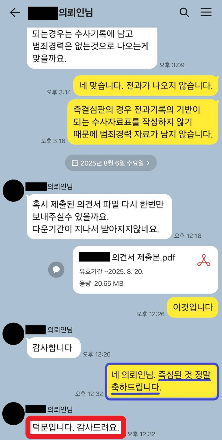 매우 다행히도 담당 수사관께서는 변호인의견서 내용을 읽어본 후 송치하지 않고, 즉심 처분을 해주셨습니다. 따라서 본사건은 검사에게 송치되지 않고, 경미범죄 심사위원회를 거쳐 즉결심판 법원으로 넘어갔습니다.