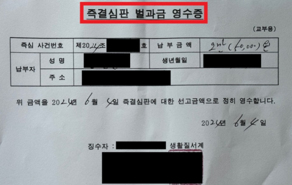 (다른 사건의 영수증이지만 첨부함 - 즉심을 받게 되어 벌금을 내면 위와 같은 영수증을 받는다)