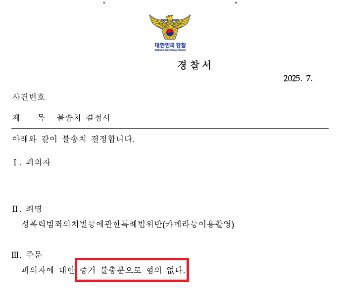 5. A씨는 카메라촬영죄 사건에서 저희의 조력을 받음으로써 경찰단계에서 불송치 처분을 받으셨습니다.