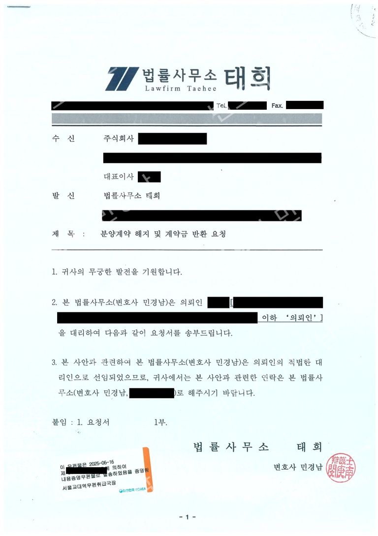 본 사건은 의뢰인께서 2025년 0월 0일 서울 강남역 앞에서 지식산업센터 모델하우스의 호객행위로 인해 방문하게 된 사안입니다. 당시 의뢰인은 청약금 일부인 50만 원을 입금하면 여행상품권과 복권을 준다는 말과 환불이 가능하다는 설명을 듣고 입금했으나, 같은 날 환불 의사를 밝혔음에도 시행사 측에서는 당첨되었다며 모델하우스 방문을 요구했습니다. 의뢰인은 2025년 0월 0일 50만 원을 환불받기 위해 모델하우스를 방문했으나, 오히려 전매를 도와주겠다는 말에 속아 분양대행사의 팀장으로부터 경기도 평택시 000 소재 지식산업센터에 대한 분양계약을 체결하고, 총 분양대금 2억 4천만 원 중 계약금 2,413만 원을 지급했습니다. 이후 의뢰인은 계약 체결 후 0월 0일 시행사에 전화로 청약철회 의사를 밝혔고, 두 차례 분양대행사를 방문하거나 영업사원에게 청약철회 의사를 표시했으나, 계약금 반환이 이루어지지 않았고 저를 찾아오시게 되었습니다.