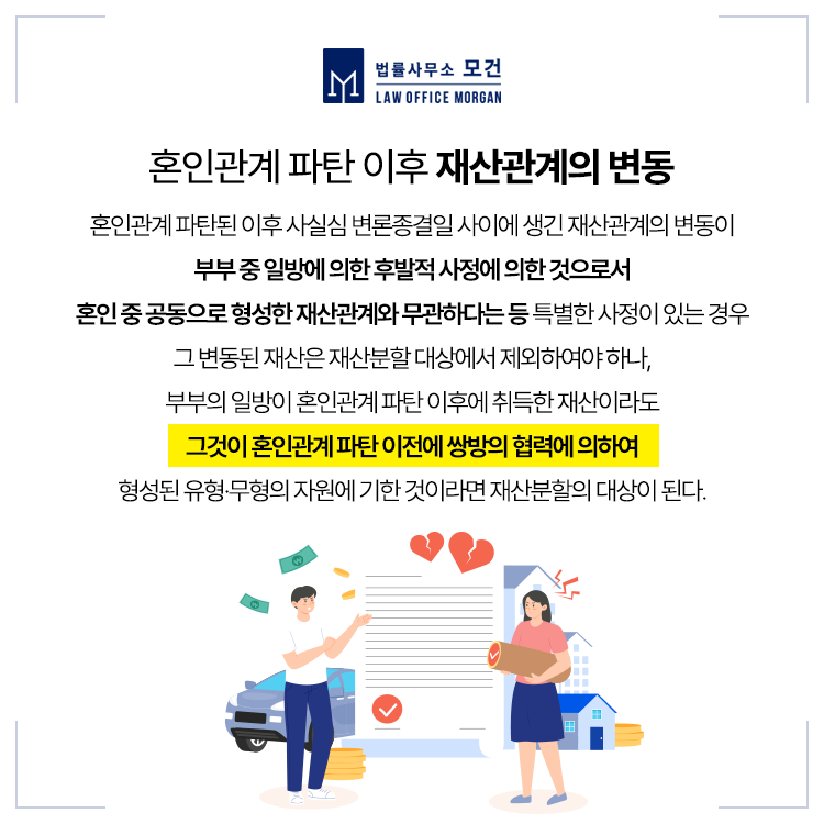 예를들면 별거기간이 일방이 부동산을 취득하거나, 주식으로 재산이 증식된 경우 또는 사업실패로 채무자 증가한 경우 등 별거 중에 재산이 크게 달라지는 경우도 있어 이에 대해 불이익이 없도록 전문가의 철저한 검토가 필요합니다.