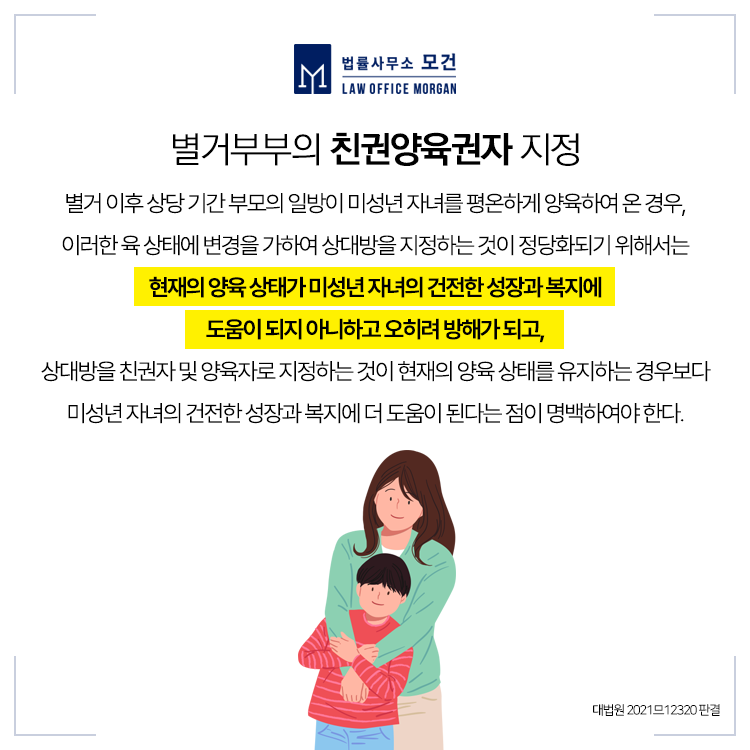 다만 자녀의 친권자 및 양육자지정에 있어서는 별거기간 동안 자녀를 평온하게 양육하여 온 일방이 유리할 수 있습니다. 우리 법원은 특별한 사정이 없는 한 평온하게 양육되어 온 양육환경을 특별한 사정없이 변경하는 것을 허용하지 않고 있으므로, 자녀의 친권과 양육권 지정을 꼭 원하시는 분들이라면 전문가의 법률도움을 받으셔야 합니다.