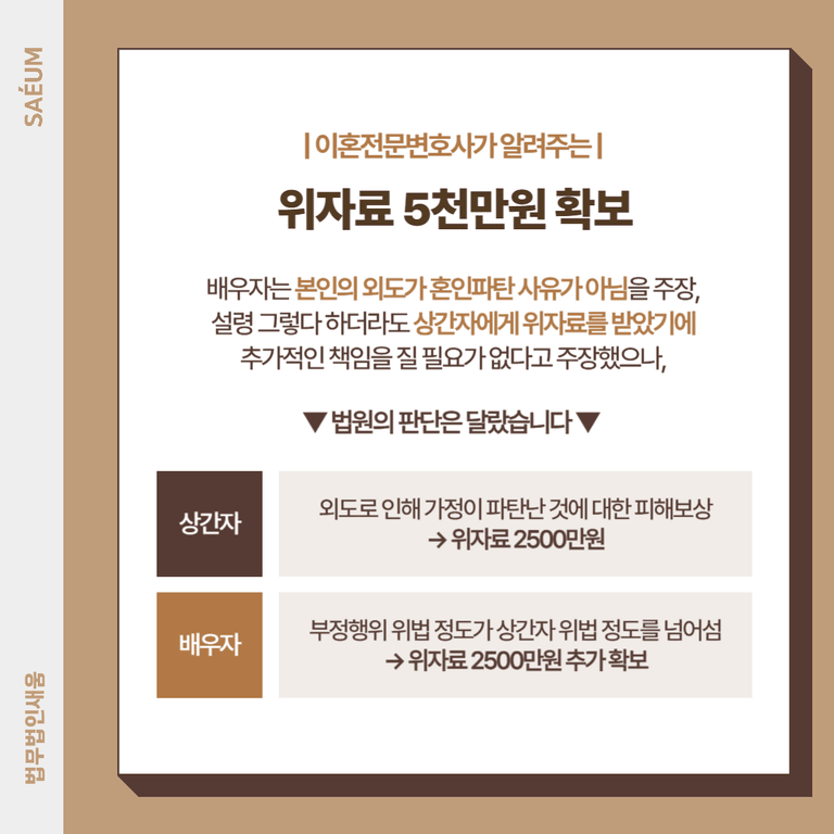 법무법인 새움에서는 B씨가 해당 사건 전에 이미 과거에 다른 사람과 부정행위를 저질렀으나 A씨가 이를 용서해주었고, 현재 문제가 된 부정행위를 알게 된 후에도 용서하고 원만한 관계를 유지하려고 노력했다는 점을 강조했습니다. 이와 같은 노력에도 불구하고 B씨는 성관계를 포함한 부정행위를 6년 동안 지속했다는 점, 이혼에 대한 논의를 한 후에도 함께 거주하며 여러 차례 가족여행을 다니는 등 평범한 부부생활을 해왔다는 점, 본인의 잘못을 인정하지 않고 반성하지 않으며 가사조사 과정에서 A씨로 인해 혼인파탄이 되었고 이혼 후 상간자와 함께 살 것이라고 발언한 점, 부정행위의 위법 정도가 제3자의 위법 정도 이상이라는 점을 주장하여 B씨로부터 2,500만 원을 추가로 확보하였습니다.