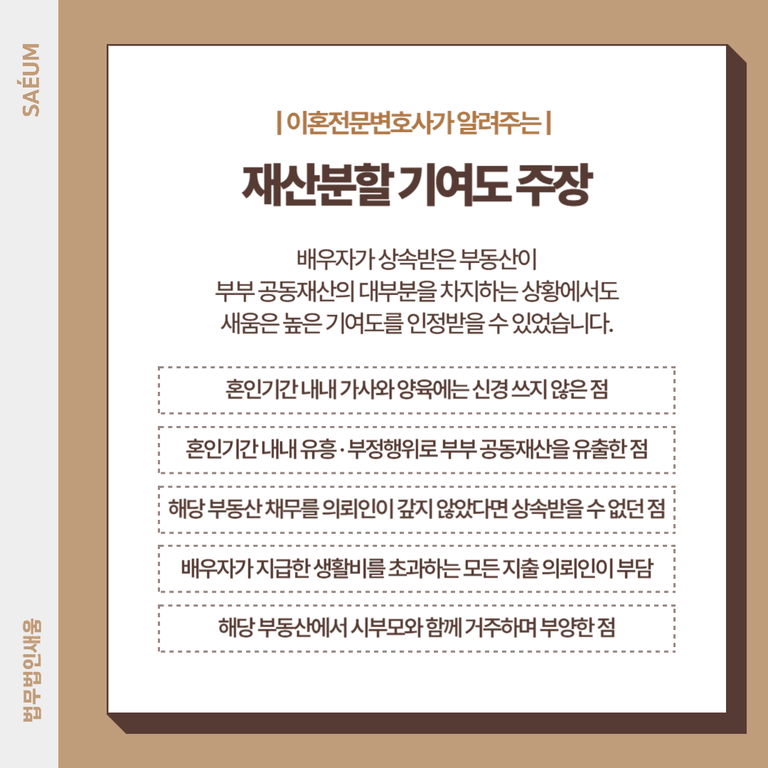 이혼 재산분할, 상세한 기여도를 주장했습니다.