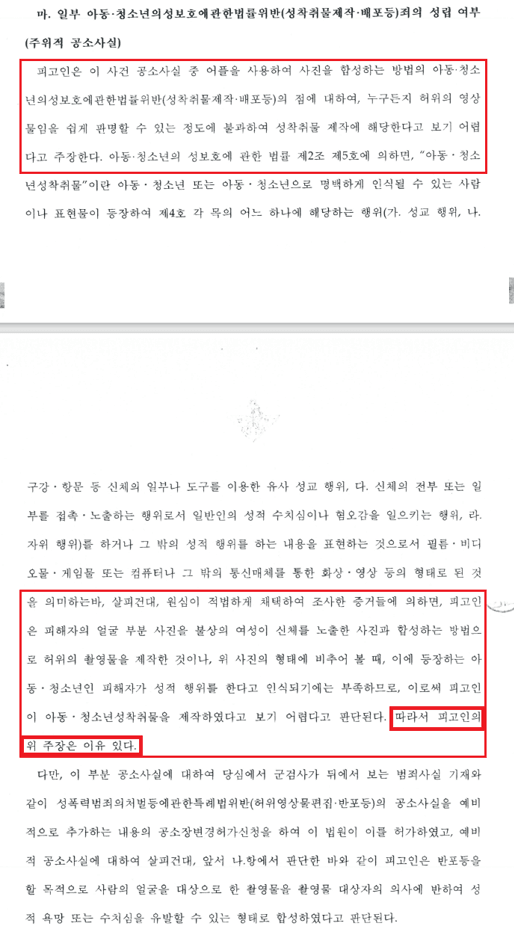 이에 대해 저는 해당 합성 사진이 너무나 조잡하게 만들어져, 누가 보더라도, 얼굴 사진과 몸의 사진이 다르다는 사실을 쉽게 판별이 가능하고, 그에 따라 비록 미성년자의 얼굴 사진이 붙어있어도, 몸 사진에서 연출되는 노출이나 성적 행위가 위 얼굴 사진의 대상자인 미성년자가 그러한 행위를 한 것이 아님을 명확하게 알 수 있었다는 점을 주장하며, 성폭법 위반 허위영상물 편집 반포 등에 해당함을 별론으로 하더라도, 검사가 기소한 아청법 위반, 성착취물 제작에는 해당하지 않음을 2심 재판부에 강조하였습니다.
