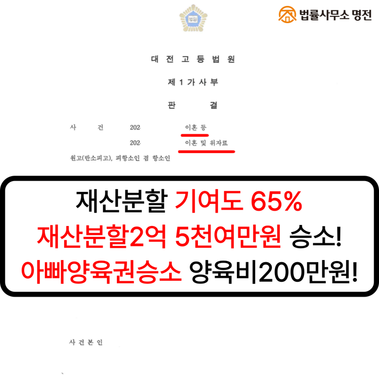 재산분할 기여도 65% 인정하여 재산분할 2억5천여만원 승소!