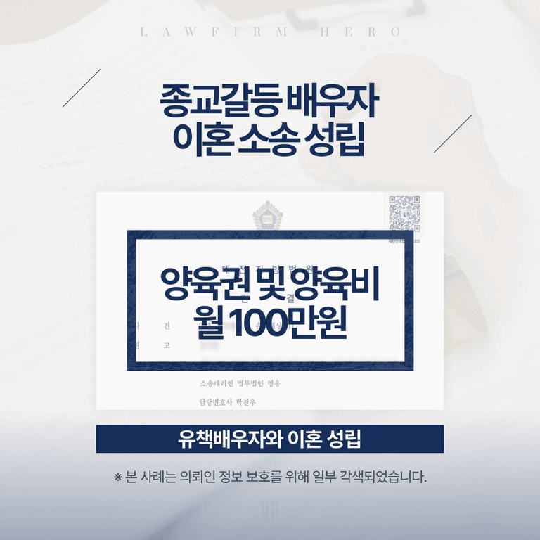 결국 더 이상 함께 살 수 없다는 판단 하에 이혼청구소송을 결심하게 되었지만, 남편은 "가정을 지키는 것이 신의 뜻"이라며 완강히 거부했고, 종교갈등이혼에 협조하지 않았습니다. 이혼을 간절하게 원하는 의뢰인 L 씨는 이혼시양육권만 확보하고 싶다며 저희 영웅을 찾아주셨습니다.