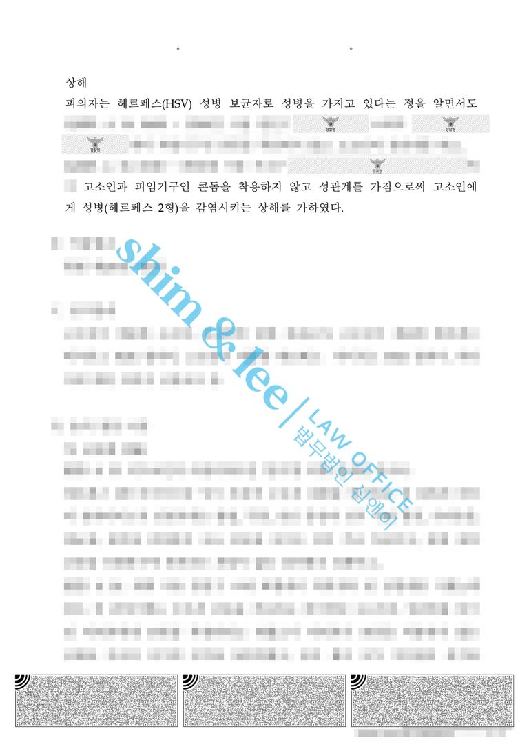 - 하지만 며칠 뒤, 의뢰인은 성기 주변에 가려움과 따가움을 느끼기 시작했습니다. 의뢰인은 곧바로 성병 검사를 진행하게 되었고, 검사 결과 헤르페스 2형 양성 판정을 받게 되었습니다. 이에 의뢰인은 감염 경로와 인과관계를 명확히 밝혀 가해자를 형사고소하기 위해 심앤이를 찾아주셨습니다.