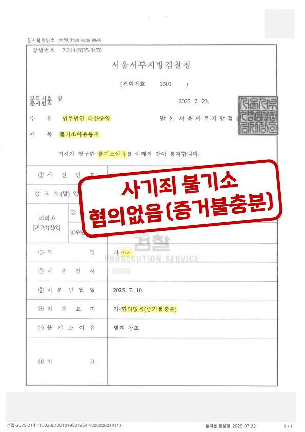 그 결과 검찰은 의뢰인 A씨의 사기죄는 증거가 불충분하여 혐의가 없다는 결론을 내리고, 불기소 결정을 내렸습니다. A씨가 신속하게 이동규 변호사를 찾아주셔서, 재판까지 가지 않고 무혐의로 사건을 종결할 수 있었습니다.