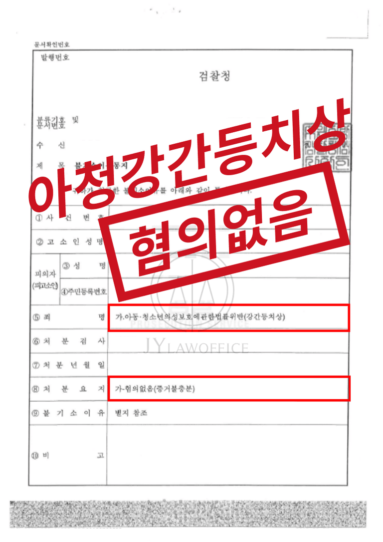 이와 같은 본 성범죄 전문 변호사의 조력에 따라, 의뢰인은 아청법위반 강간치상 혐의에 대하여 혐의없음 처분을 받고 사건을 무사히 종결시킬 수 있었습니다.