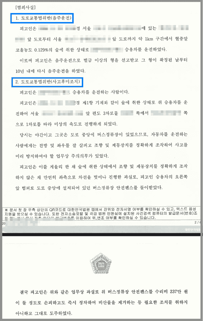 그런데 의뢰인은 집행유예 기간 중 또다시 혈중알코올농도 0.129%의 만취 상태로 차량을 운전하다가 버스정류장 안전펜스를 충격하는 사고를 내고 말았고, 사고 이후 조치를 취하지 않고 도주하다가 검거되었습니다.