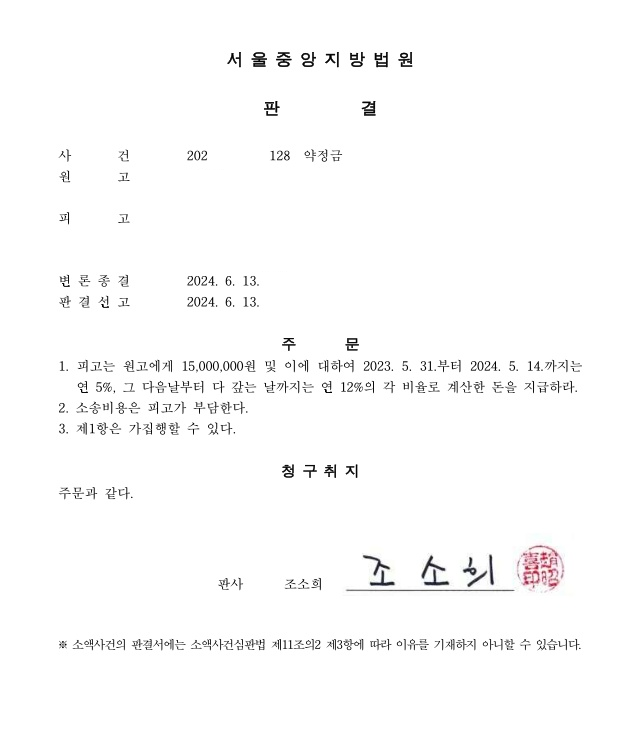 그런데 피고는 원고의 승낙을 받아 도시가스관을 연결하였음에도 약정과 달리 1,500만원을 지급하지 아니하였는바, 원고가 피고를 상대로 약정금 청구 소송을 제기하여 전부승소 판결을 받아낸 사례입니다.
