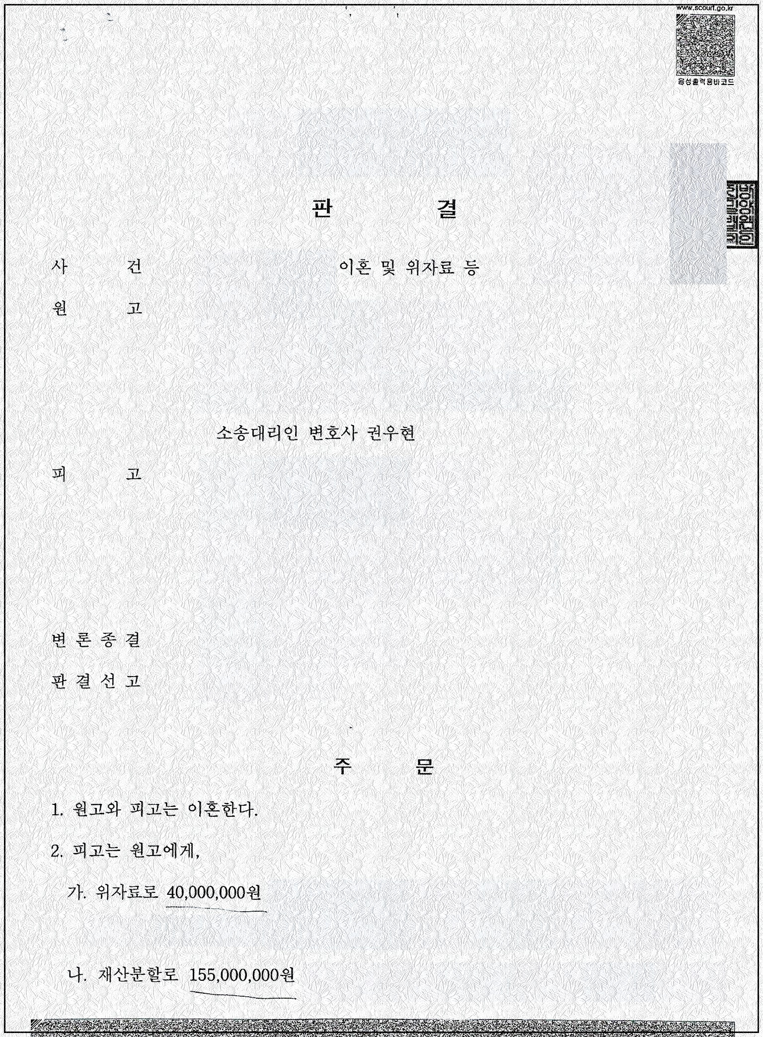 3. 아래의 판례는 피고에게 부정행위나 정당한 이유 없는 가출, 원고에 대한 폭행 상해 등 중대한 잘못이 없음에도, 평소 원고를 무시하고 원고에게 폭언한 정도의 유책행위와 이혼 소송 도중 피고 명의의 부동산을 원고와 상의 없이 매각하였다는 잘못을 들어 원고의 이혼청구를 이유 있다고 본 뒤(원고가 가출한 사실이 있고, 피고가 부동산을 팔자, 원고도 피고가 타고 다니던 원고 명의의 고가 수입차를 피고와 상의 없이 판 사실이 드러 났음에도 피고 잘못이 더 크다고 보았음), 원고에게 지급할 위자료를 4,000만원으로 정하여 그 지급을 명하였고, 재산분할에 관하여는 현재 원고 명의로 되어 있는 재산을 원고 소유로 하고 추가로 피고로부터 1억 5,500만원을 더 지급받는 것으로 정하였습니다(따라서 이혼소송을 재산적 측면에서만 바라 본다면 중요한 비중은 재산분할에 있습니다).