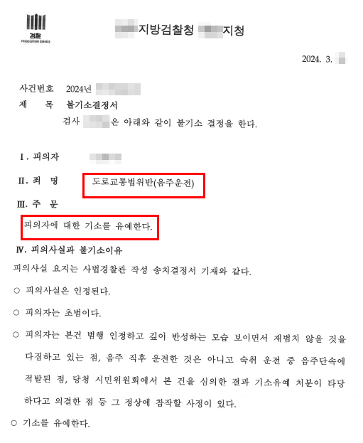 그 결과 검찰에서는 의뢰인이 연루된 음주운전 혐의에 대해 ‘기소유예’로 선처해 주었습니다.