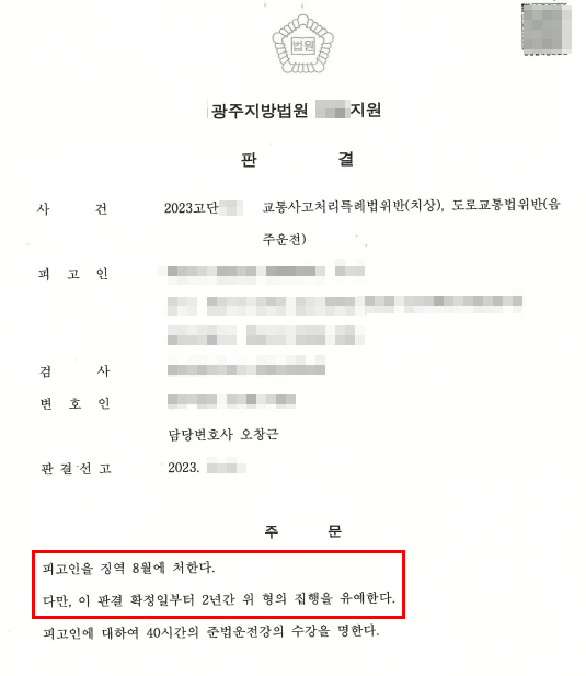 그 결과 법원에서는 음주사고 혐의에 대해 ‘집행유예’로 선처해주었습니다.