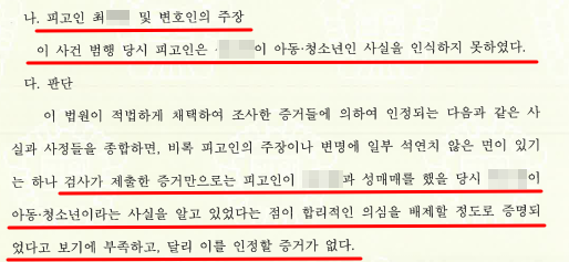 이에 오창근 변호사는 의뢰인이 성매매한 사실은 인정하지만, 피해자가 미성년인줄은 몰랐다고 변호하였습니다. 다만, 피해자는 14세밖에 안된 미성년자로 일반인의 입장에서 보았을 때 누구라도 피해자가 미성년임을 알 수 있다는 점이 문제가 되었습니다.