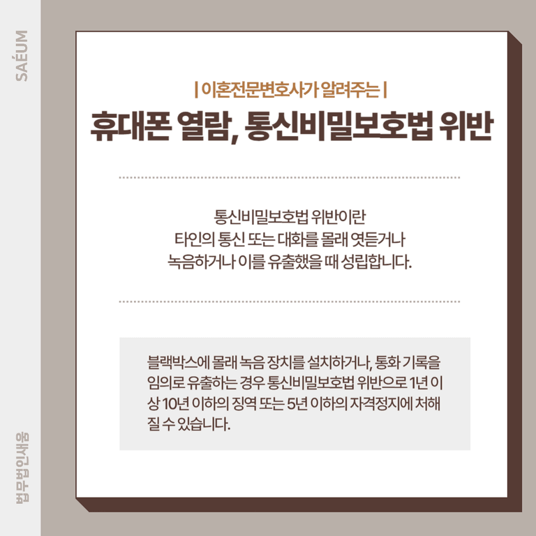 만일 이러한 상황에서 남편 몰래 휴대폰을 열람한다면, 법적으로 문제가 될 수 있다고 전문가들은 지적합니다. 이혼을 준비하면서 배우자의 외도 사실을 확인하려고 몰래 스마트폰을 열었다가 비밀침해죄로 고소당할 수 있으니 주의해야 합니다.