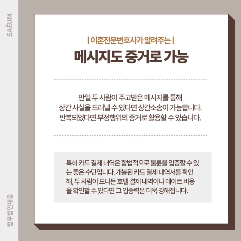 이러한 내용이 밤늦게 반복적으로 오갔다면 부정행위의 증거로 활용이 가능합니다. 남편의 회사 동료나 주변인의 증언, 공개된 장소에서 촬영한 사진, 카드 결제 내역 등을 토대로도 자료를 수집할 수 있습니다.