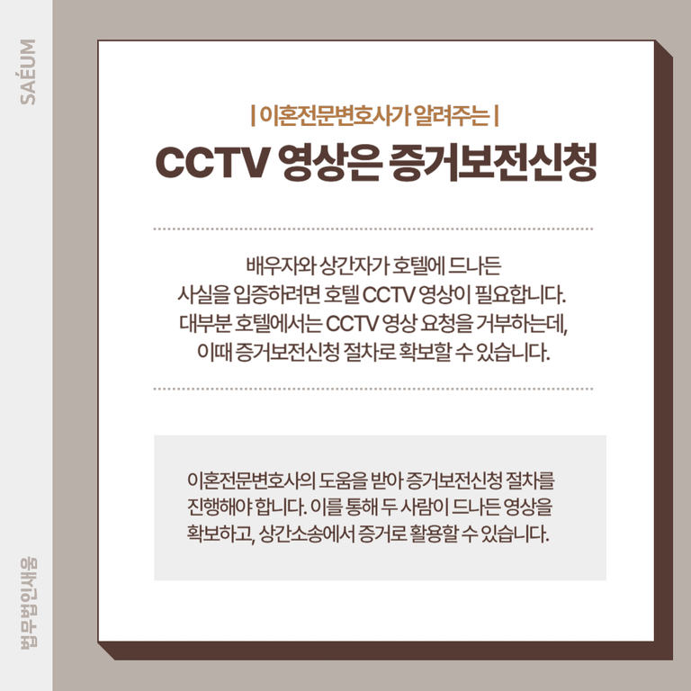 배우자가 호텔을 드나든 사실을 확실히 입증하려면 CCTV 영상이 필요합니다. 그러나 직접 호텔에 찾아가 영상을 요청해도 대부분 거절당합니다.
