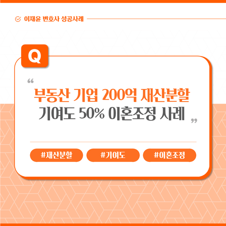 의뢰인과 상대방은 약 25년간 결혼 생활을 유지했습니다. 상대방은 혼인 중 부친으로부터 중소기업을 상속받았는데, 상속 당시 해당 기업은 부채가 상당한 부실기업이었습니다. 의뢰인과 상대방은 위 기업을 성실하게 일구었고, 의뢰인은 부동산 투자에 적극적으로 임한바, 부부의 총 재산이 200억(회사의 가치가 70억, 부동산이 130억 상당)에 이르게 되었습니다.