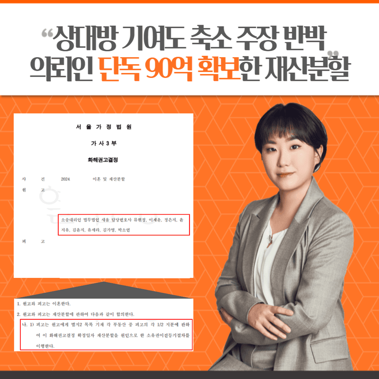 본 법무법인은 다수의 이혼 및 재산분할 소송을 진행하며 다양한 형태의 재산분할 합의서 작성과 판결문 확보한 경험이 있는바, 실무 경험을 바탕으로 의뢰인이 추가적인 분쟁과 위험을 피하고 재산권을 안정하게 확보하여 드리고 있습니다.
