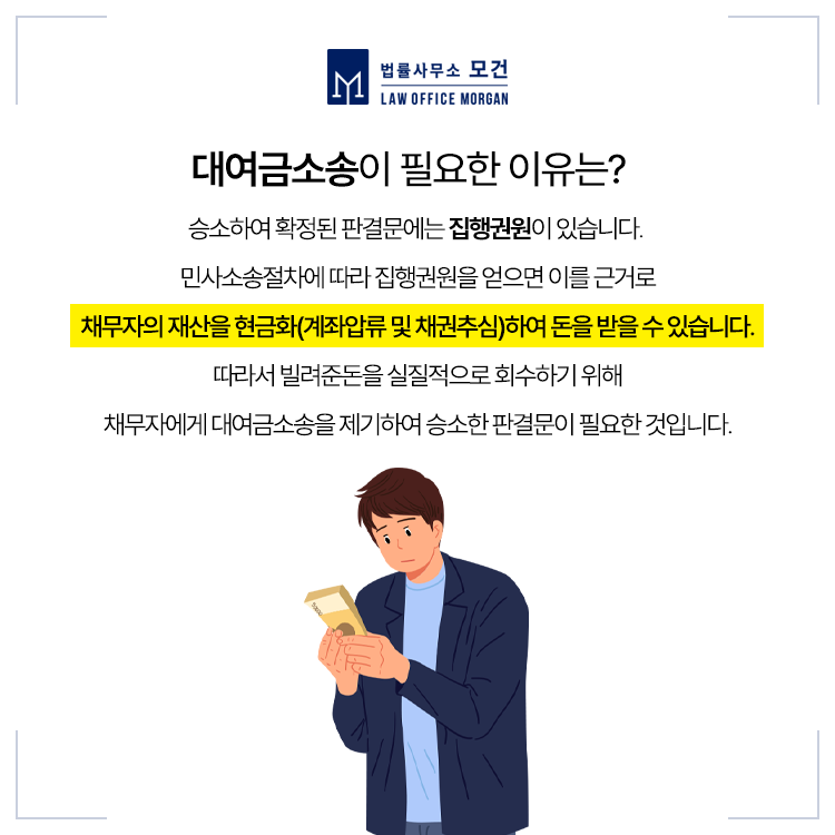 대여금소송은 단순히 상대방에게 빌려준돈을 청구하는 것에 그치는 것이 아니라, 법원의 판결을 통해 받아야 하는 돈의 정확한 액수를 확정하고 강제집행까지 이어갈 수 있는 절차입니다.