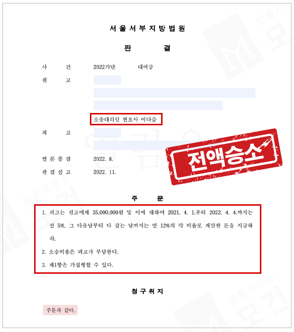 실제 위 이미지의 판결문 사건에서, 법률사무소 모건의 이다슬 변호사는 의뢰인의 이체내역과 피고와의 대화내역을 통해 못받은돈 합계 3,500만원 전액과 소송비용까지 피고 부담으로 전부승소 할 수 있었습니다.