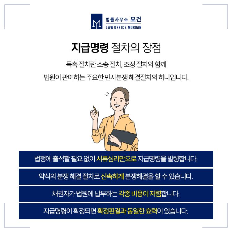 확정된 지급명령은 판결문과 같아서, 상대방의 계좌압류 및 추심이 가능합니다. 또 소송과 달리 청구인이 제출한 서류만을 심사하기 때문에 절차가 매우 빠르고 비용도 저렴해서 대여금소송이 부담되시는 분들이 선택할 수 있는 또다른 방법입니다.