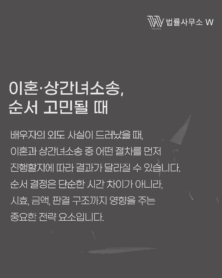 배우자의 외도를 알게 되었을 때, 이혼과 상간녀소송 중 무엇부터 해야 할지 혼란스러운 경우가 많습니다.