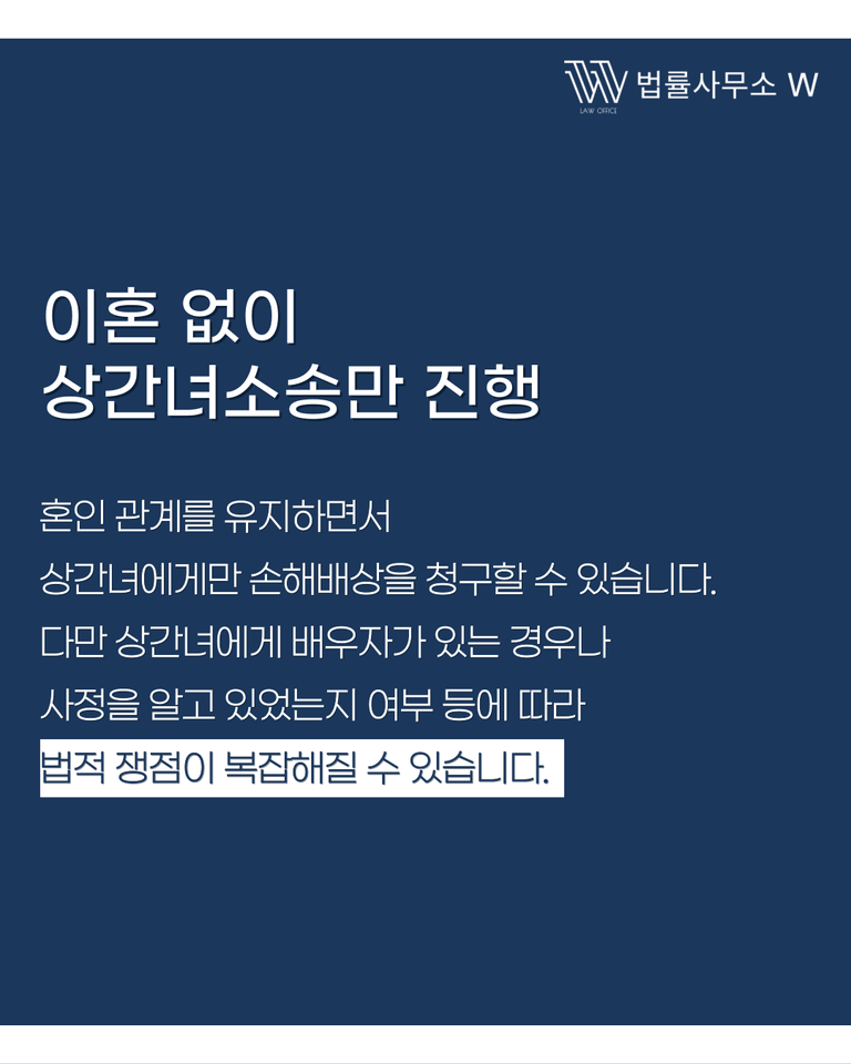 혼인을 유지하면서 상간녀에게만 손해배상을 청구하는 방법입니다. 하지만 상간녀에게 배우자가 있는 경우, 상대방의 배우자가 사정을 알고 있었는지 여부 등 복잡한 쟁점이 생길 수 있어, 전문가 상담이 필수입니다.