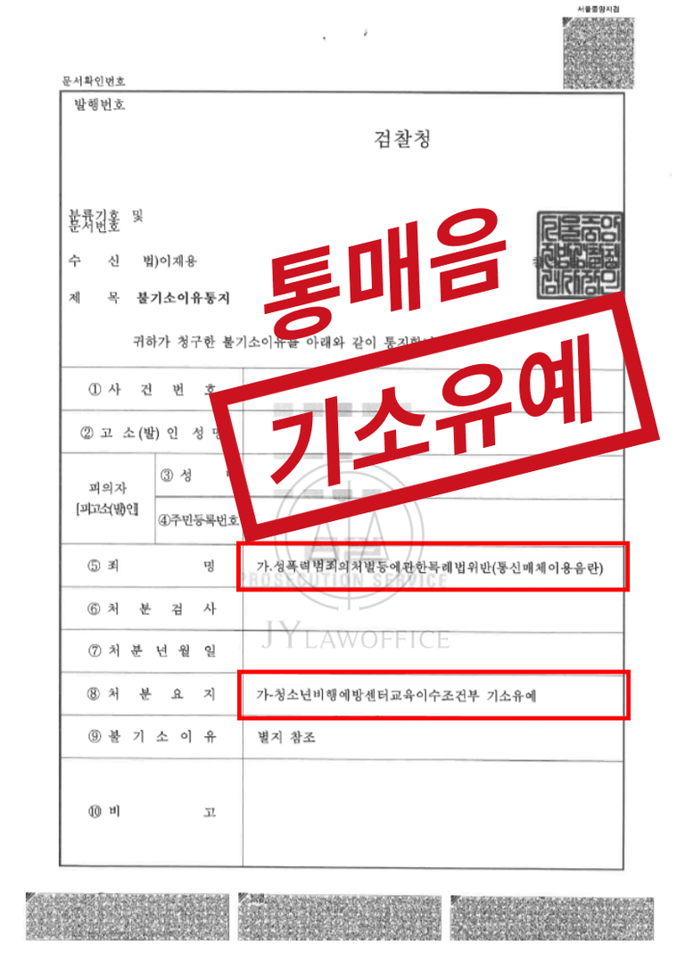 이와 같은 통매음 전문 변호사의 조력에 따라, 의뢰인은 통매음(통신매체이용음란죄) 혐의를 받았지만, 기소유예 의 불기소 처분을 받고 무사히 사건을 종결시킬 수 있었습니다.