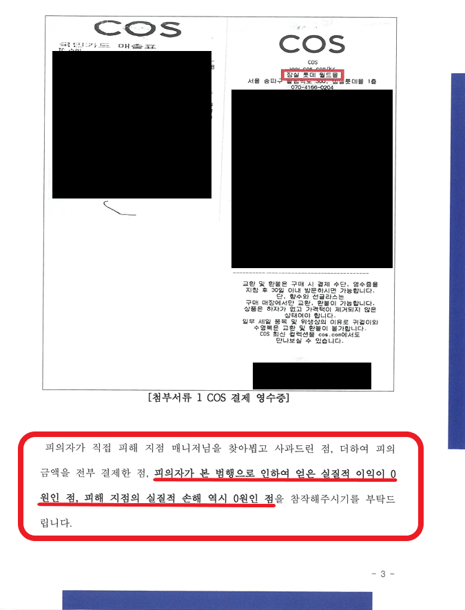- 변호인과 함께 피해 지점에 방문하여 고개 숙여 사과드렸고, 매니저의 허락을 받아 20만 원을 결제하였음. 따라서 최소한 절도한 금액만큼은 손해 배상을 완료함