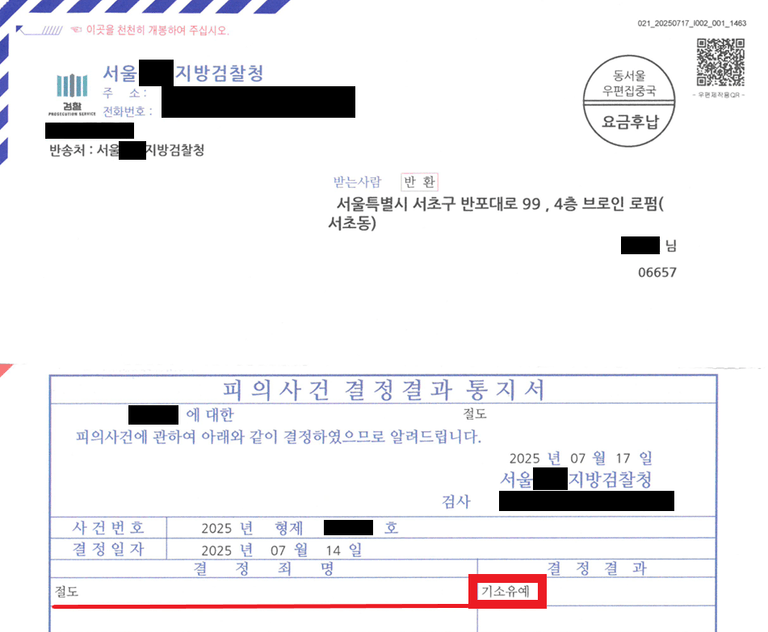 다행히도 담당 검사는 의견서 내용을 고려하여, 피해 지점과 합의가 되지 않았음에도 A에게 '기소유예' 처분을 하였습니다. 그리고 그 통지서도 제 사무실 한 곳으로 도달되었습니다. 이로서 A는 어떠한 전과도 남기지 않고 + 부모님이 아무도 사건을 모르게 사건을 끝낼 수 있었습니다.