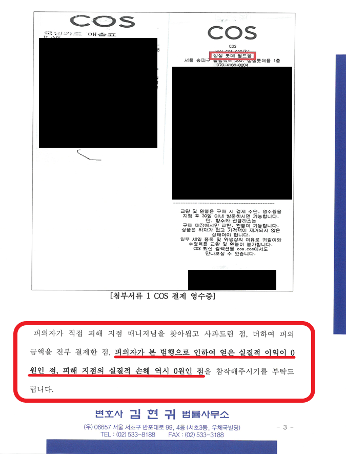 저에게 가장 많이 문의하시는 사건 중 하나가 코스트코, 다이소, 이마트, 올리브영, COS와 같은 대형 체인 마트 절도 사건입니다. 그 중 합의를 해주지 않은 매장의 경우에도, 본 사건과 같이 피의자에게 존재하는 참작사유들을 최대한 모아모아서 의견서에 제출한다면 충분히 기소유예를 받아낼 수 있습니다.