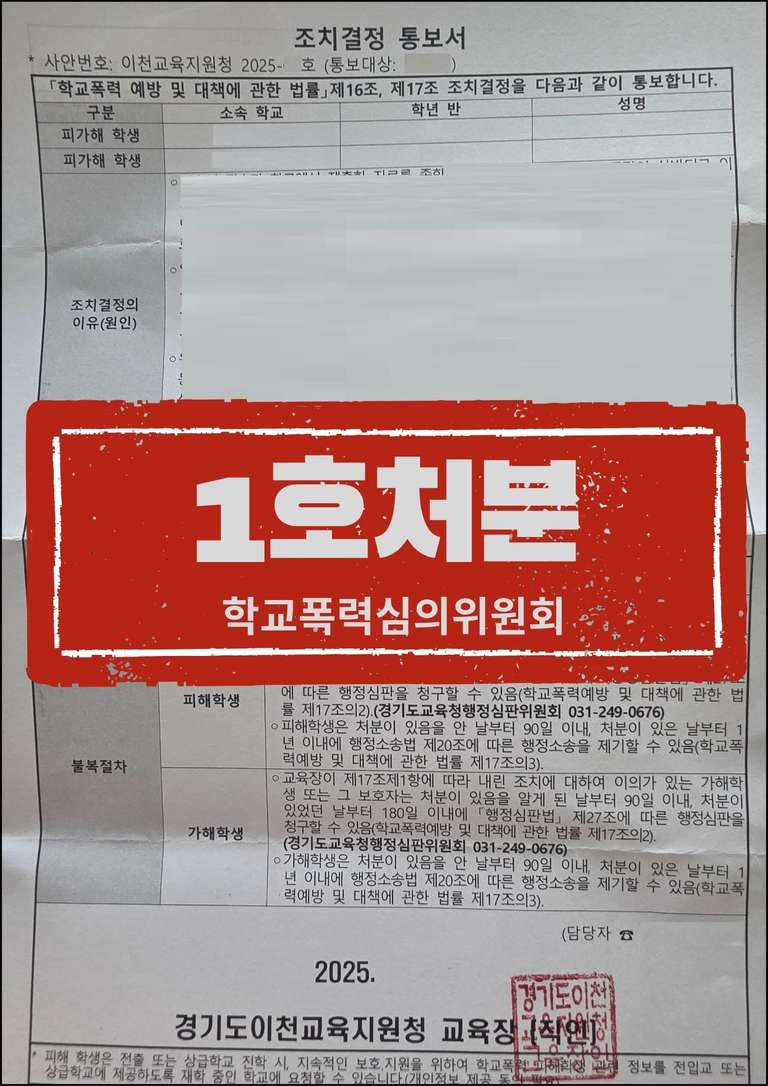 1호조치는 생활기록부에 기재가 되지도 않을 뿐더러, 가해학생이 받을 수 있는 조치 중 가장 가벼운 결정입니다. 결과적으로 성공하였지만, 만약에 다른 학생들의 폭행과 제가 대리한 학생 사이의 관련성을 부인하는 데 실패하였다면 4호조치 이상의 무거운 조치가 나올 수도 있는 상황이었습니다. 실제로 다른 학생들은 제가 대리한 학생보다 훨씬 무거운 조치를 받게 되었습니다.